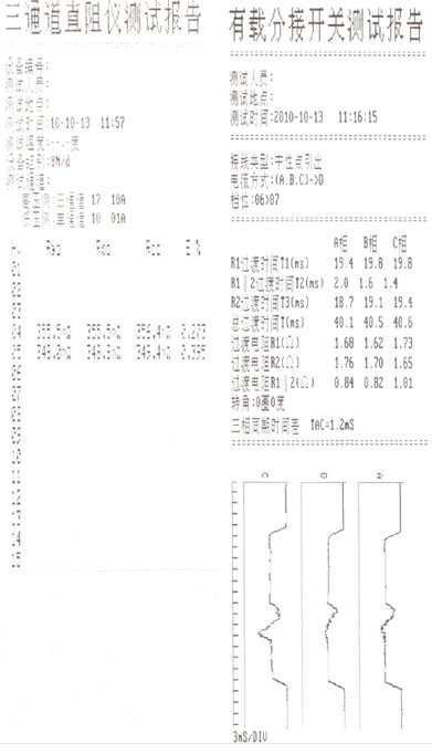 2010.10.13日在浙江金华佛堂县一110kV变电所里对我们公司的三通道直流电阻测试仪、有载开关测试仪进行测试。考核的试验对象是变电所的主变压器,该110kV三相双圈变,容量为50000kVA,型号为SZ11-50000/110,联接组别为YND11,调压方式为有载调压,调压机构是MR公司生产的有载调压分接开关,过渡电阻为3.2Ω的并联电阻。以下是这次考核时用本公司的CT3310三通道直流电阻测试仪及CT3000有载分接开关测试仪所测的试验数据: