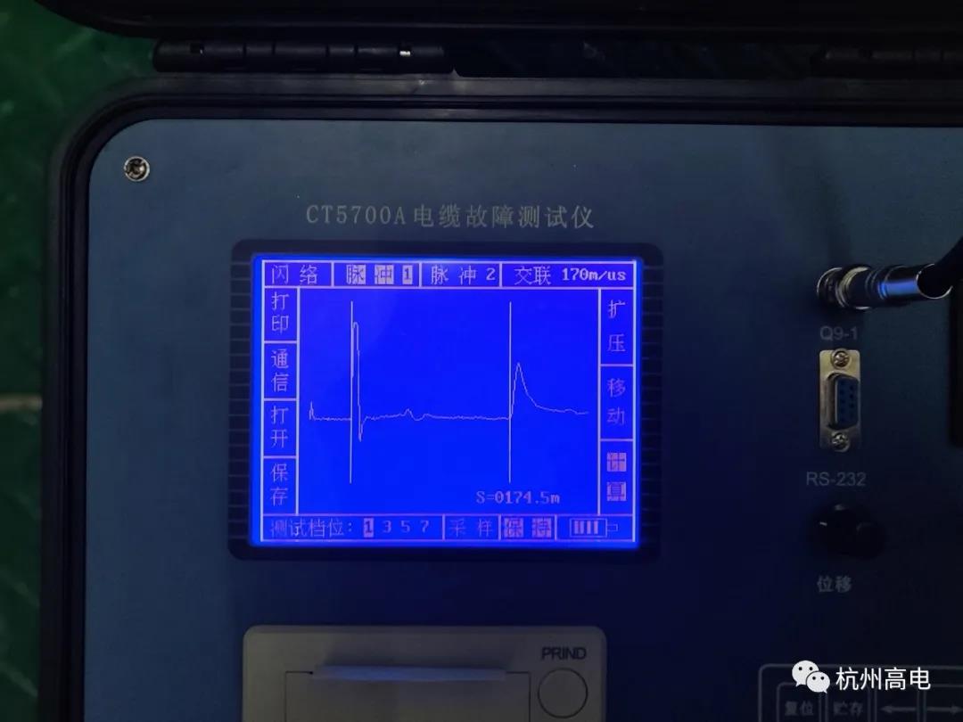 试验详情:测试前了解,电缆从附近小区配电房敷设至酒店配电房,全长约500多米,送电后显示接地跳闸故障。针对此现象,我司技术人员先通过电缆绝缘耐压判断故障相位,显示A、B、C三相同时存在故障的表现,通过CT5700A电缆故障识别仪,进行低压脉冲法初测故障点位置,最后配合高压闪络法放电与声磁同步监听效果,对故障位置精确定位的查找,最终顺利找到故障位置。从酒店配电房一端测试后发现,A、B、C三相的低压脉冲波形一致显示约367米,未显示反极性断点位置,且不满足电缆全长。从小区配电房一端测试后发现,A、B、C三相的低压脉冲波形一致显示约174米,未显示反极性断点位置,且也不满足电缆全长。因此初步判断电缆三相同时存在断路可能,信号从两端传播至故障断路点位置返回,后通过高压闪络放电与声磁同步监听确定,放电位置确实距离酒店位置约367米处,需开挖后验证。最终确定故障点位置与仪器波形显示距离吻合,故障现象为三相断路,初步判断可能由于电缆老化严重,高压负荷下对地放电引起电缆炸裂,且其他位置现象也存在绝缘层剥落,存在安全隐患。