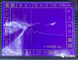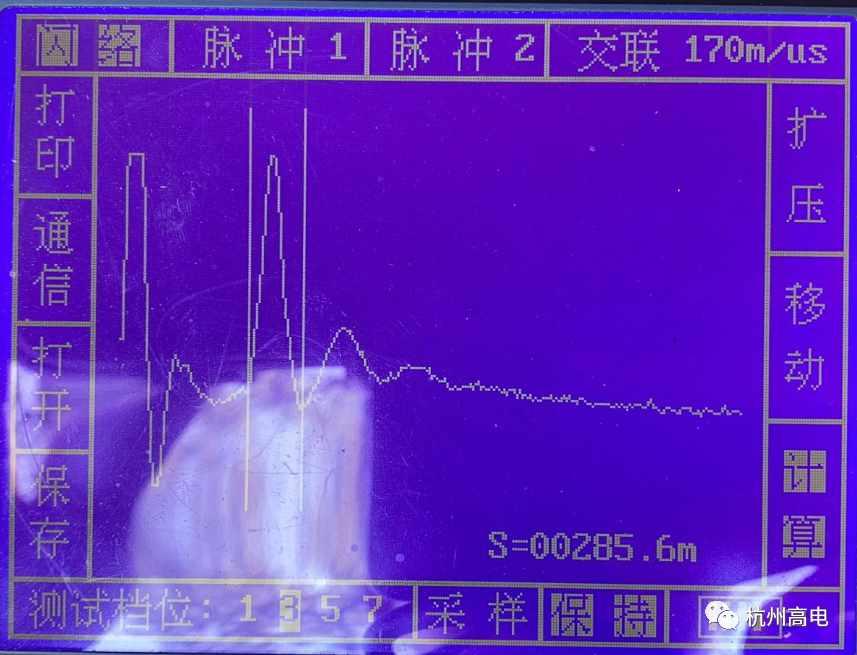 试验描述:根据试验波形分析,可以初步判断电缆故障点位于离配电柜约275米至280米处,且直流电缆正负极均粗在故障。如需判断故障点精准位置,需进行高压闪络法球间隙直流放电进行验证。针对正负极进行高压闪络法球间隙直流放电,通过对高压闪络波形的分析,故障点可能位于距电车电缆配电柜约285米处。为确定故障点具体位置,需前往故障点进行放电监听。同时针对故障电缆进行电缆路径精确识别,保证放电监听顺利进行。电缆路径识别中,其中正极距离电车电缆配电柜(2)约500米突然失去信号。经过对附近反复监测,依旧无法进行正常识别。在通过跟换试验对象(负极)之后,消失的信号再次出现。通过波形对比分析,距离电车电缆配电柜(2)约500米处,可能存在第二个故障点。该段300V电压电缆,全长约600米。通过试验数据分析及故障现象判断,电缆存在两处故障点。