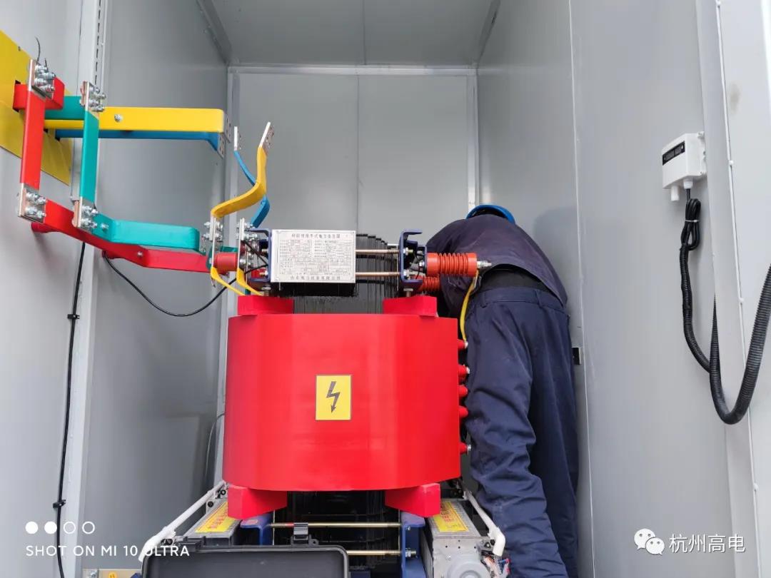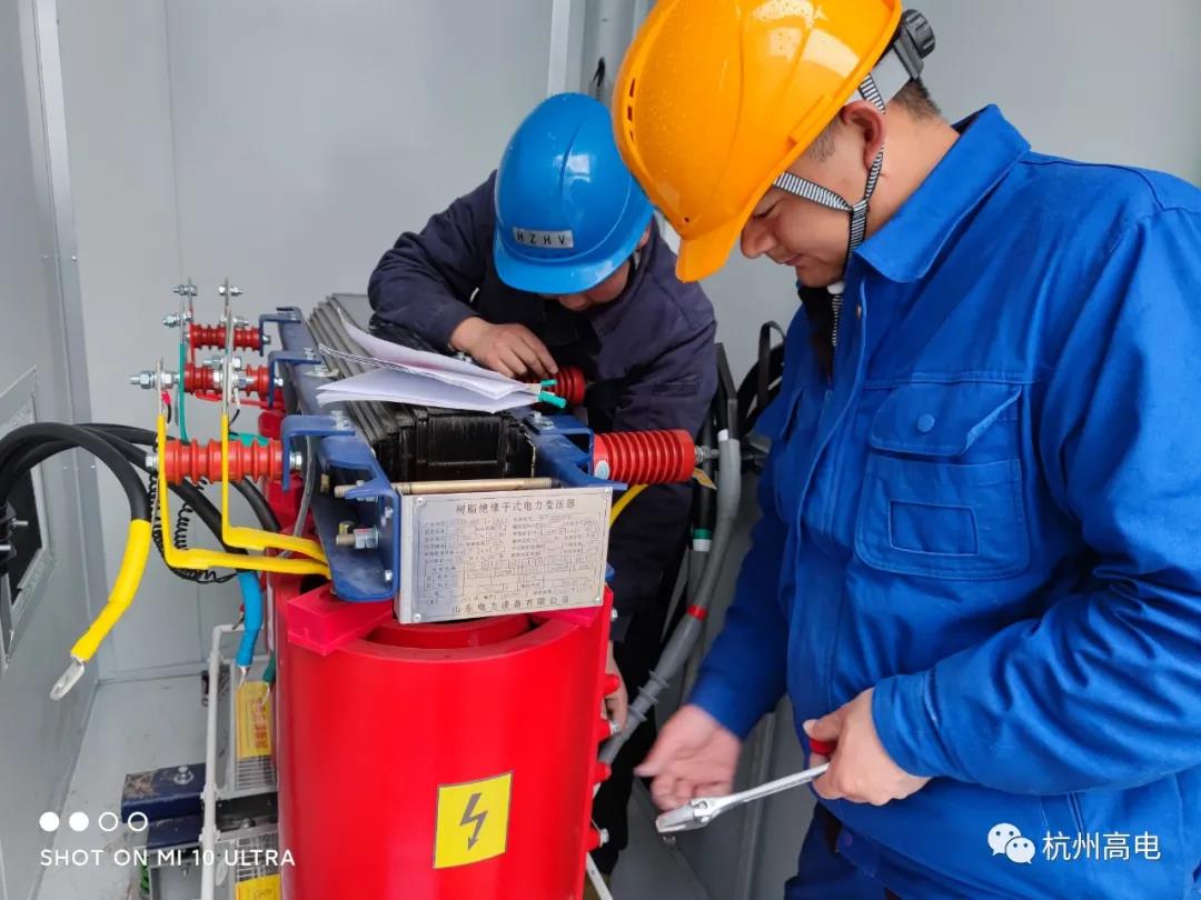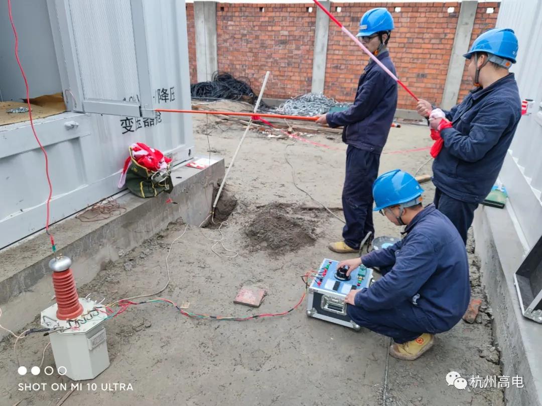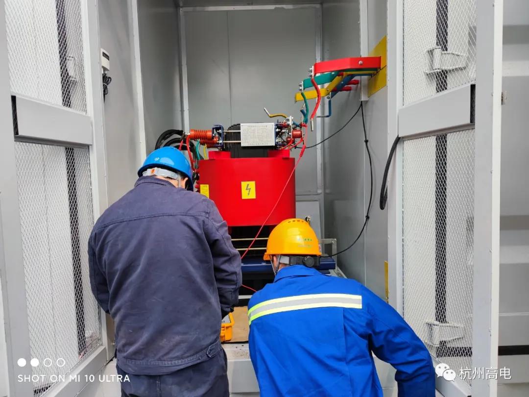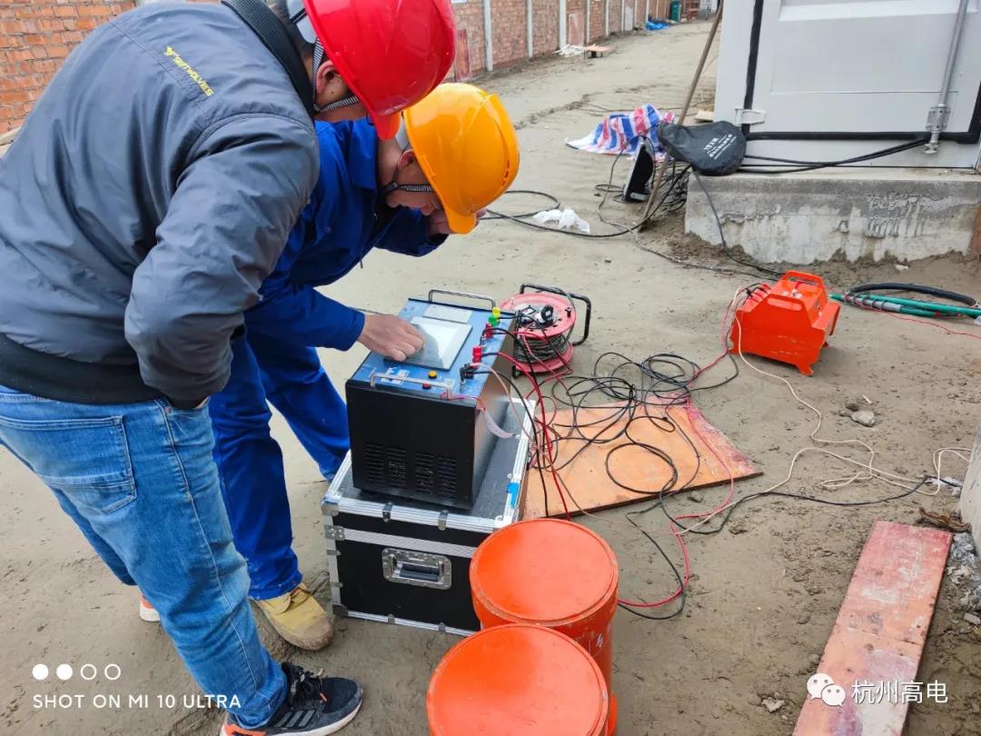 试验描述:此次试验在杭州萧山正处于建设中的“杭州电网应急电源基地“,进行了整站各电气设备的交接试验。我司电试队携带相关试验仪器设备及安全防护工具,配合现场高工及试验班组进行试验操作。本次交接试验工作时间紧、任务重。为确保在规定时间内完成,我司试验中心提前出具完整的试验方案、合理分组分班,最终试验顺利完成。我司对多台干式10kV/35kV变压器、避雷器、互感器、二次继保柜、多段10kV/35kV输出电缆等电气设备在基地内展开试验项目。现场设备仪器分工协作,接好各试验设备线路,安排各项目操作人员。各班组安全严谨地操作测试设备,对测试数据做了完整的时实记录。同时协助现场高试班组、电站值班人员、电气设备厂家完成了本次交接试验。