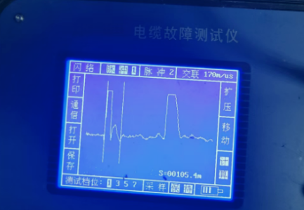 试验详情:低压脉冲:疑似故障点距离电缆终端约为105米左右(与高压闪络故障波形基本吻合)经高压闪络法放电监听,在距离电缆终端105米位置发现明显放电声音,最终成功找到故障点。