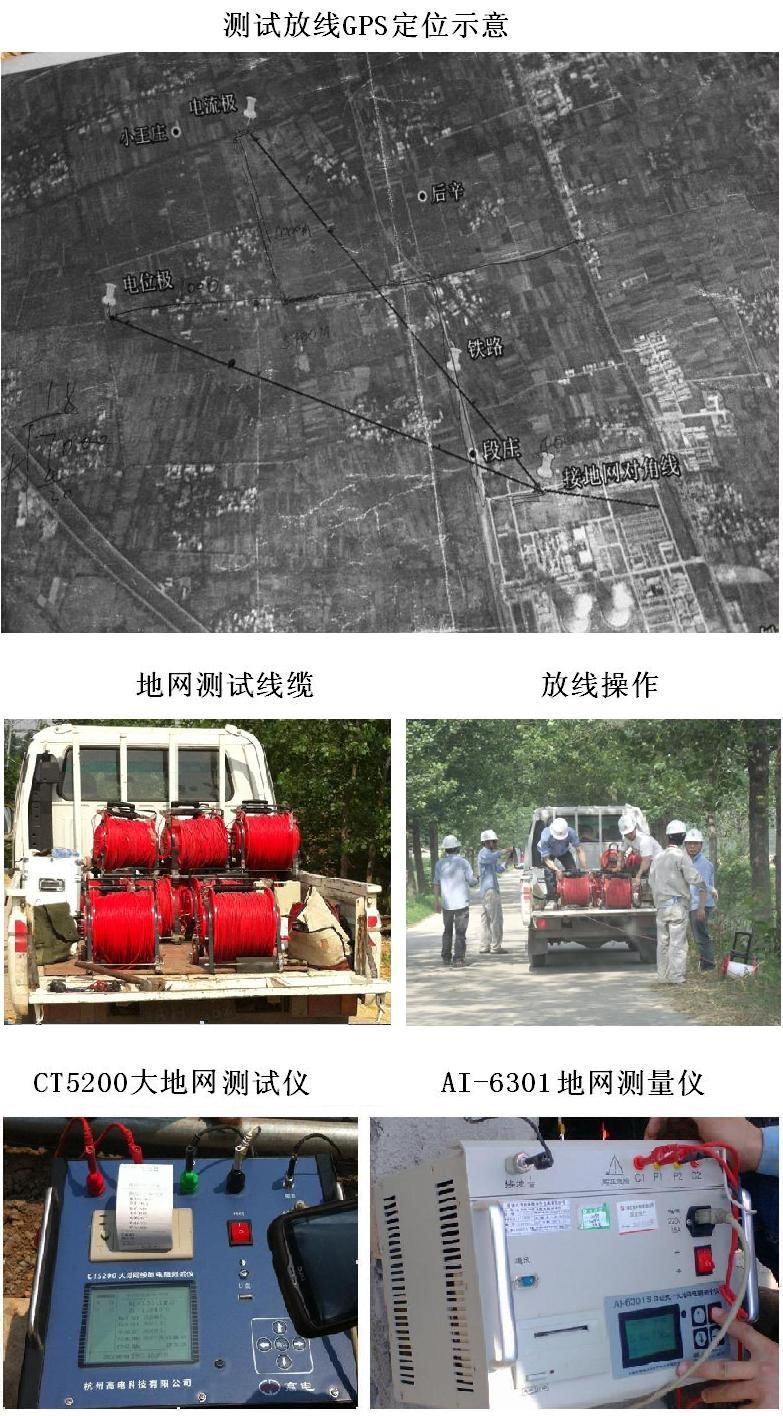 此电厂面积较大,呈长方形形状,经测其对角线长度Dm约600m。要求实测值不应大于0.50Ω。测试方法采用三角形布置辅助电流电压极。其电流极和电压极到测试点的直线距离均为2500m。夹角为30?。其GPS定位,布线、仪器、测试数据对比如图所示。