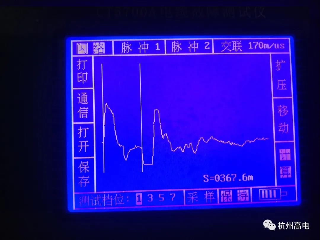 试验详情:测试前了解,电缆从附近小区配电房敷设至酒店配电房,全长约500多米,送电后显示接地跳闸故障。针对此现象,我司技术人员先通过电缆绝缘耐压判断故障相位,显示A、B、C三相同时存在故障的表现,通过CT5700A电缆故障识别仪,进行低压脉冲法初测故障点位置,最后配合高压闪络法放电与声磁同步监听效果,对故障位置精确定位的查找,最终顺利找到故障位置。从酒店配电房一端测试后发现,A、B、C三相的低压脉冲波形一致显示约367米,未显示反极性断点位置,且不满足电缆全长。从小区配电房一端测试后发现,A、B、C三相的低压脉冲波形一致显示约174米,未显示反极性断点位置,且也不满足电缆全长。因此初步判断电缆三相同时存在断路可能,信号从两端传播至故障断路点位置返回,后通过高压闪络放电与声磁同步监听确定,放电位置确实距离酒店位置约367米处,需开挖后验证。最终确定故障点位置与仪器波形显示距离吻合,故障现象为三相断路,初步判断可能由于电缆老化严重,高压负荷下对地放电引起电缆炸裂,且其他位置现象也存在绝缘层剥落,存在安全隐患。