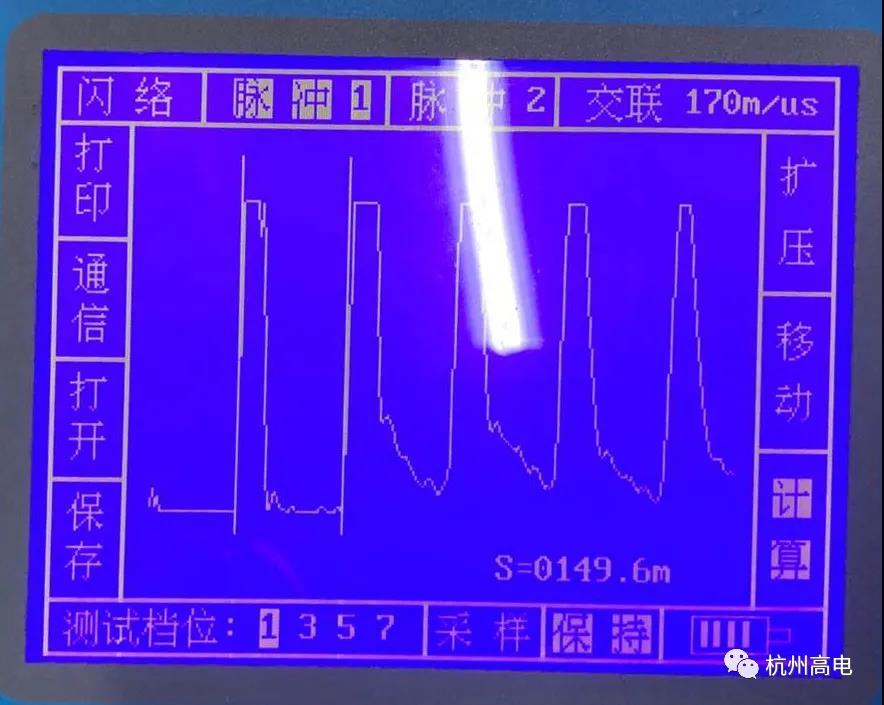 试验描述:缆头两端皆位于丁桥龙湖天街地下车库高压配电房,试验前已先将两头三相分别悬空,铠装、铜屏蔽依旧接地处理。初步测试分别测得电缆A、B、C三相对主绝缘的绝缘电阻,再用万用表分别测量电缆三相对地,相与相之间的导通情况,便于初步判断电缆故障类型。根据试验结果和现象初步判断,该条电缆B相可能存在绝缘老化或损伤的情况,但故障点和故障现象仍旧不明显,因此需要进一步进行测试判断。进一步排查利用低压脉冲法及路径测试仪先对电缆好相A、C相进行全长测试,测得电缆实际全场大约150米,与实际标牌标注相符,与以往图纸数据对比,数据接近。低压脉冲法分析:通过低压脉冲法对B相进行波形波形测试,针对波形分析发现一处疑似故障带点,位于50米位置。由于波形不是很明显,无法判断这就是故障点位,需通过高压闪络法球间隙直流放电方式进行验证。高压闪络法测试:在进行高压闪络球间隙直流放电的过程中,可以明显监听到配电房外明显的放电声音,仔细观察之后,电缆外壳有明显放电现象,经过大致估算电缆路径长度约为50米,与波形相符合。