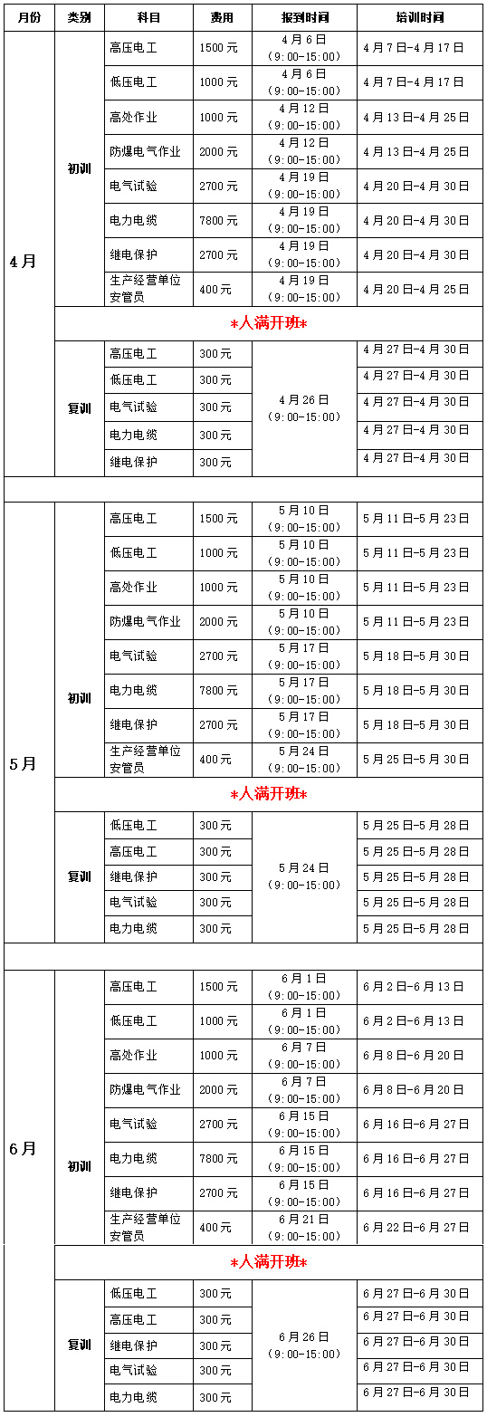 备注:以上所有项目的复训 (复审)每项学费为300元\每人(包含报名、培训、考试等费用)。