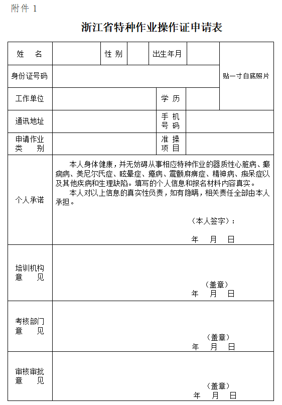 1. 浙江省特种作业操作证申请表(附件1)